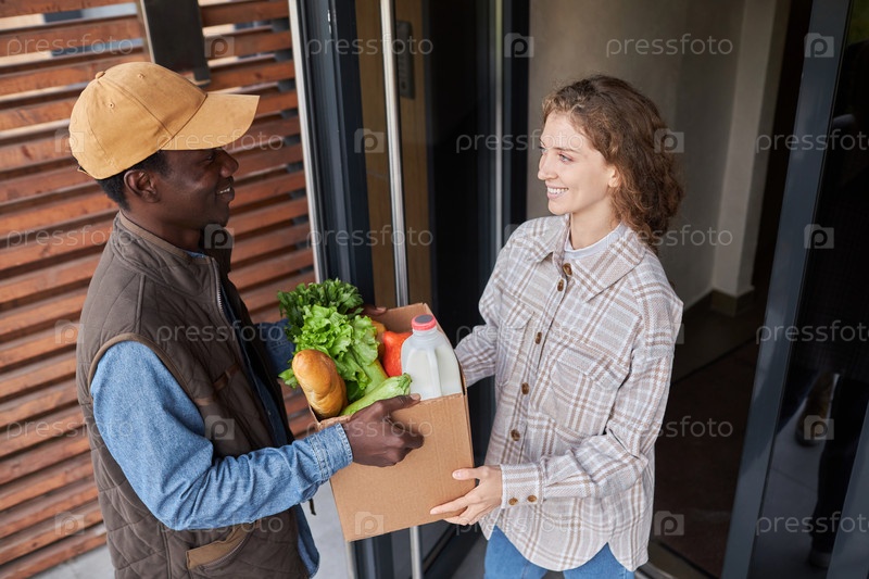 Улыбающаяся женщина держит коробку с продуктами питания на открытом воздухе с доставщиком