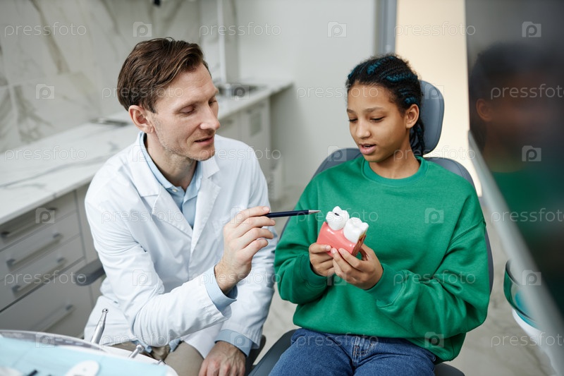 Чернокожая девочка-подросток сидит в стоматологическом кресле и держит зубную модель