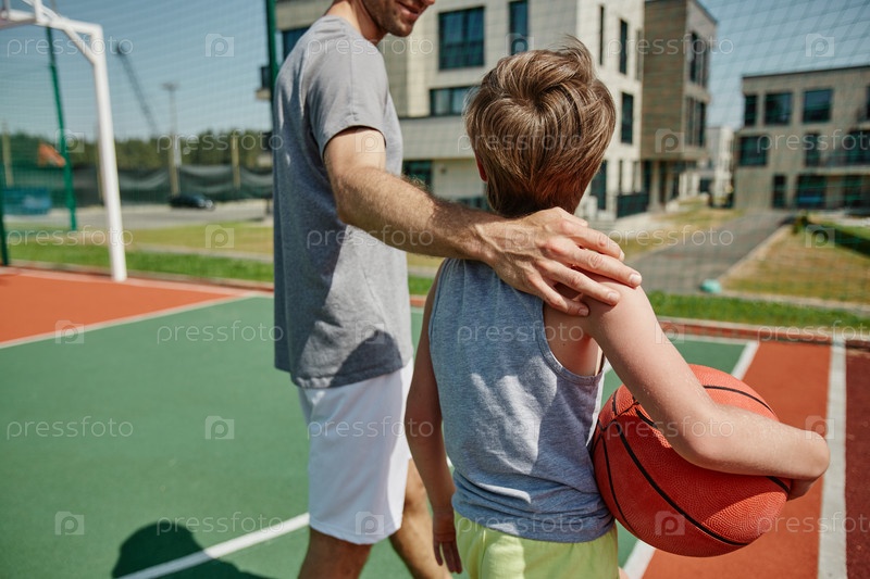 Счастливый отец и сын играют в баскетбол вместе и стоят на поле, обнимаясь