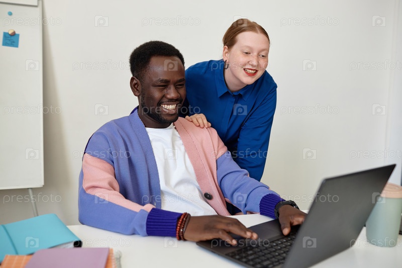 Творческая команда дизайнеров с чернокожим мужчиной, использующим ноутбук и улыбающийся в офисе