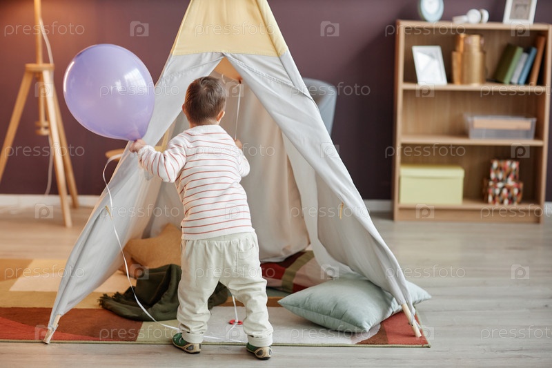 Задний вид милого маленького мальчика, играющего с палаткой дома и держащего воздушный шар