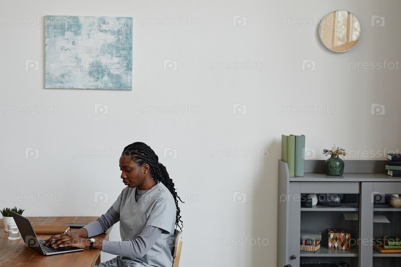 Молодая чернокожая женщина в роли медсестры, использующей ноутбук