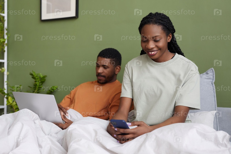 Молодая пара использует гаджеты в постели