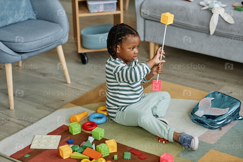 Черный ребенок играет с игрушками на полу