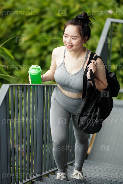 Позитивная спортсменка поднимается по лестнице в тренажерный зал