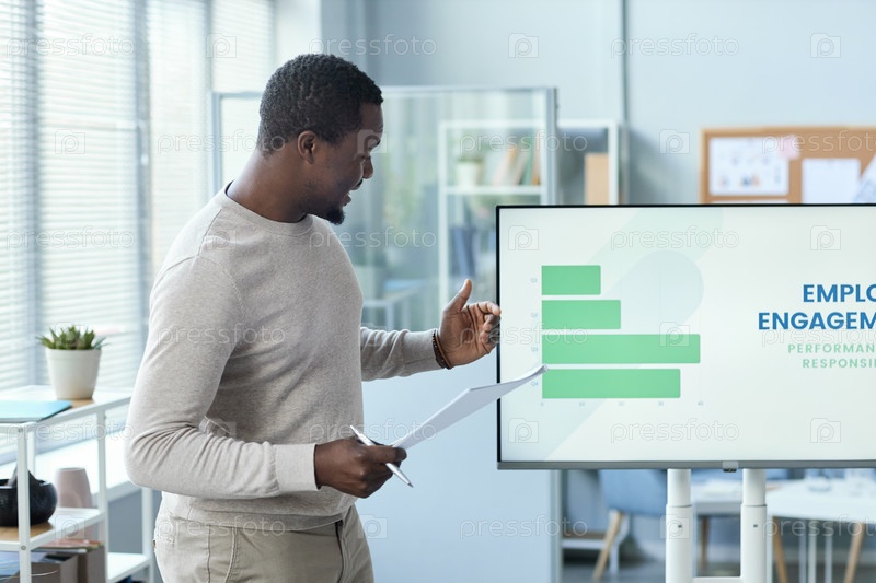 Чернокожий мужчина дает презентацию в офисе, стоя у цифрового экрана