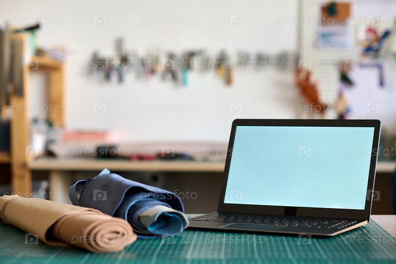 Пустой экран беспроводного компьютера, стоящего на рабочем месте таннера