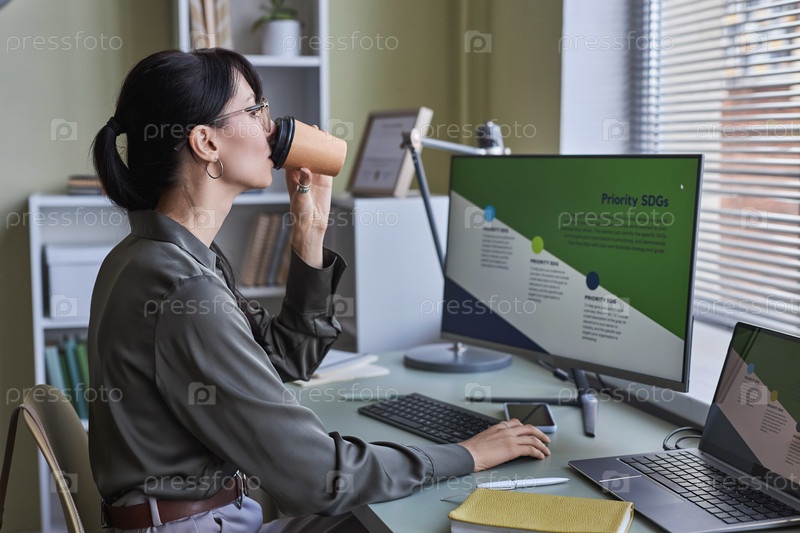 Молодая женщина пьет кофе в офисе у стола