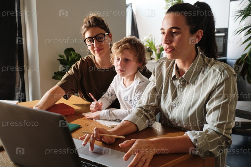 Семья, использующая ноутбук в учебе
