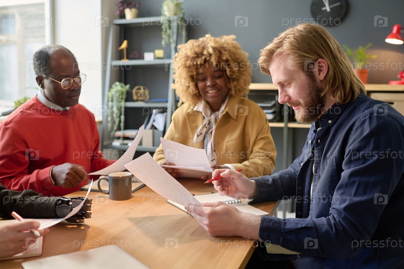 Бизнес-партнеры, рассматривающие контракты на встрече
