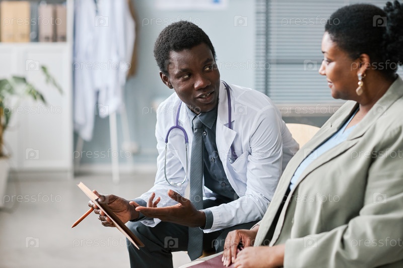 Чернокожий молодой человек в качестве врача, консультирующего женщину-пациента в клинике