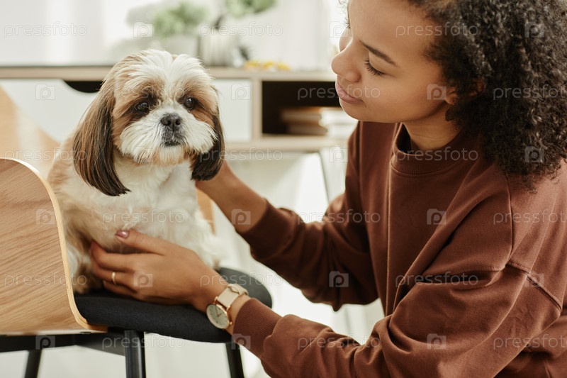 Молодая чернокожая женщина играет с милым собакой