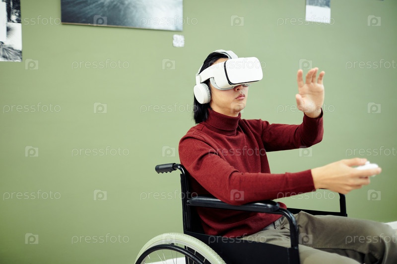 Азиатский мужчина, носящий гарнитуру VR на выставке