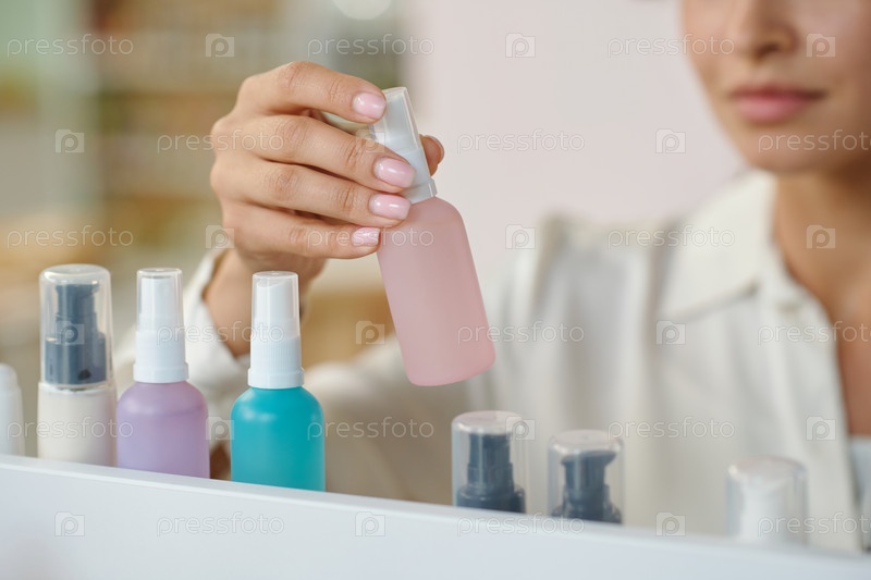 Рука молодой женщины, держащей пластиковую бутылку с жидким продуктом самообслуживания