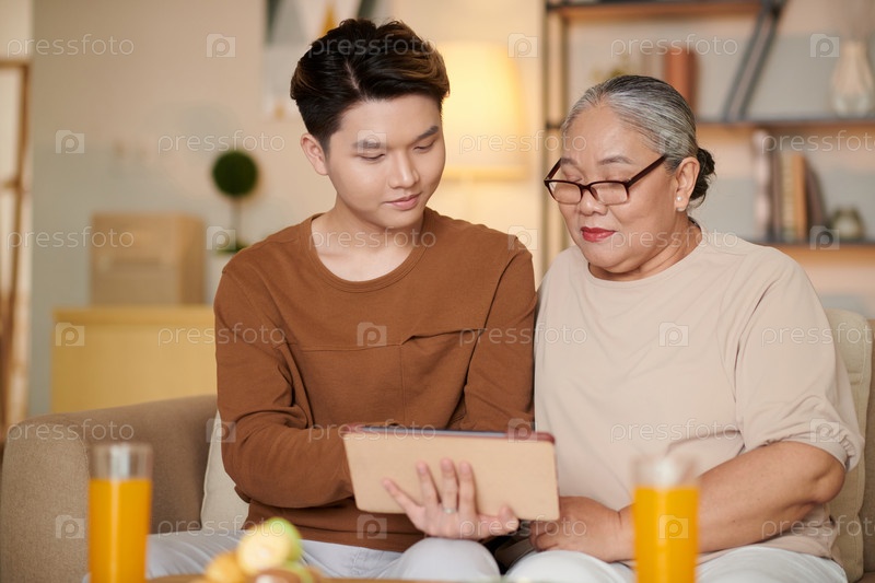 Бабушка и сын используют приложение на планшете