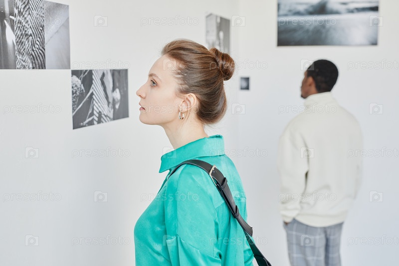 Молодая женщина смотрит на картины в художественной галерее