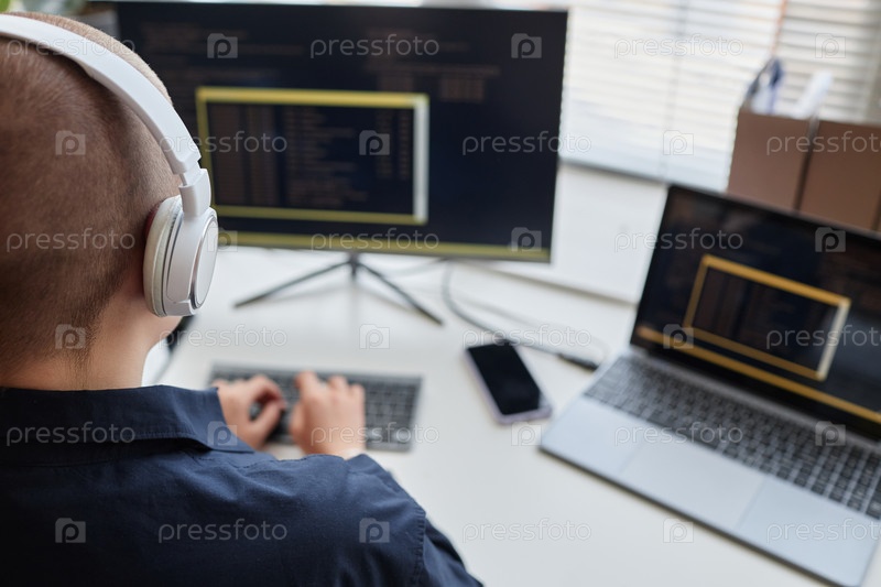 Задний вид лысой молодой женщины, которая носит наушники и пишет код