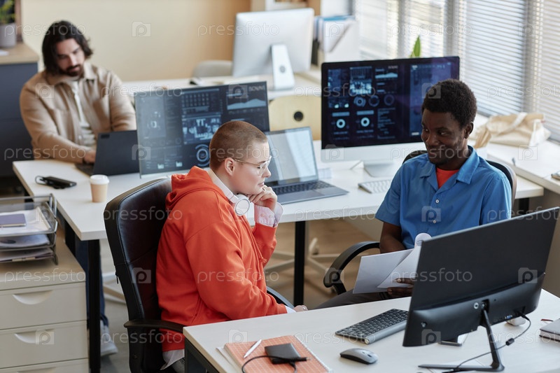 Молодой афроамериканский менеджер-мужчина с документами, делающий отчет коллеге