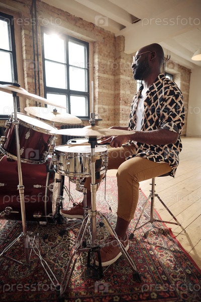 Африканский барабанщик, выступающий на наборе барабанов