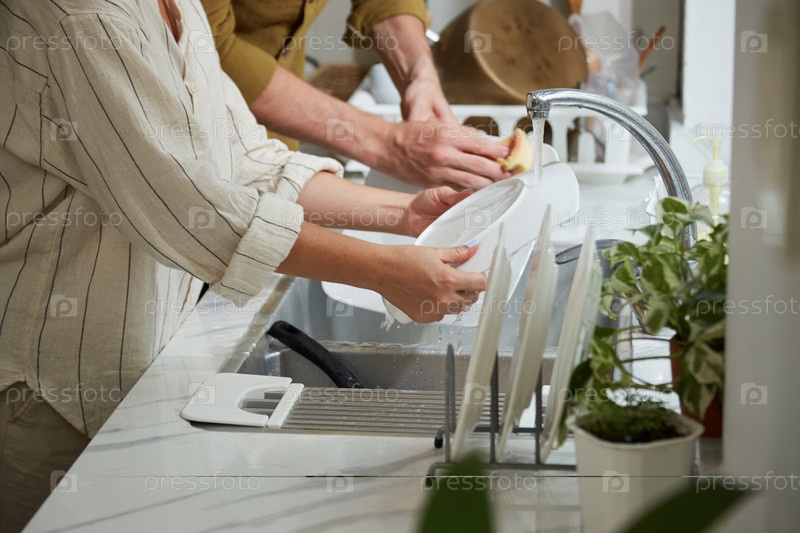 Обрезанное изображение пары, промывающей тарелки под водопроводной водой после ужина дома