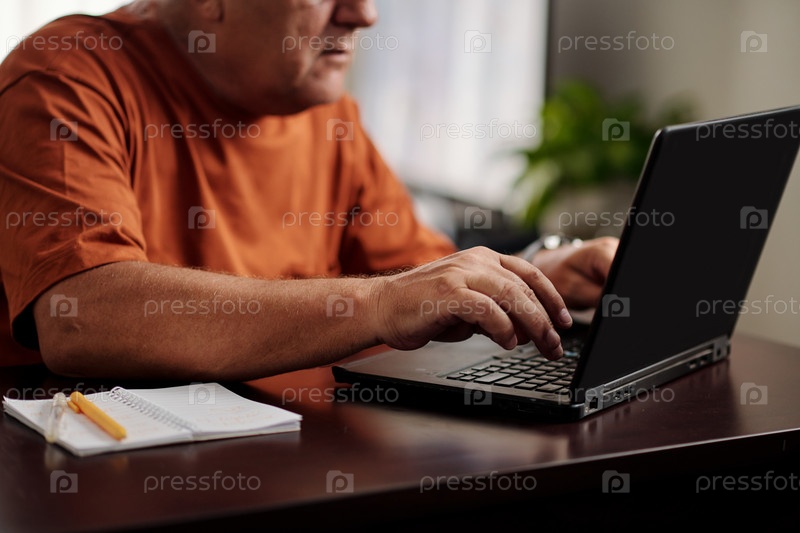 Пожилой мужчина работает на ноутбуке