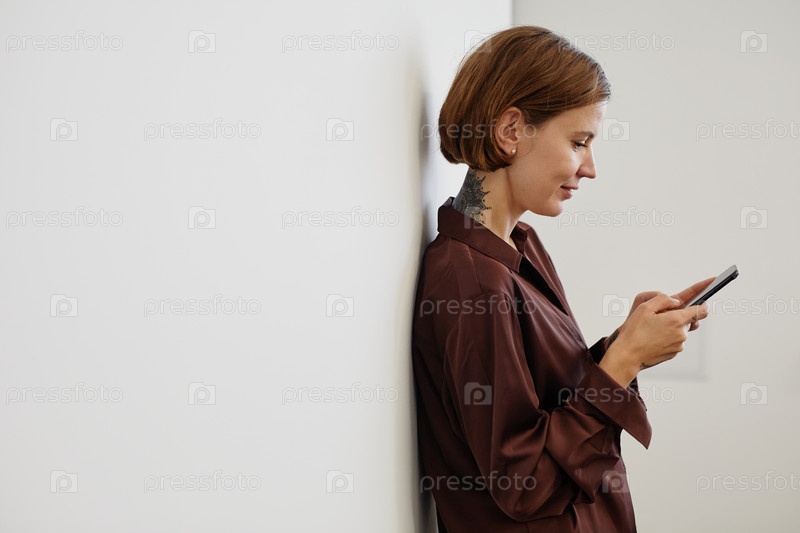 Татуированная женщина, использующая смартфон в офисе Minimal