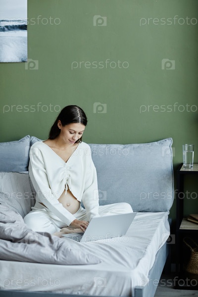 Беременная женщина использует ноутбук в спальне