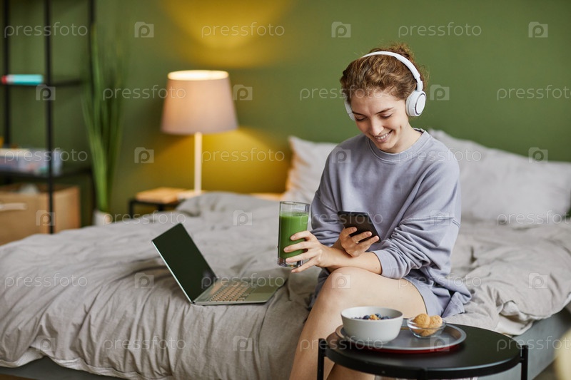 Женщина, использующая мобильный телефон во время завтрака