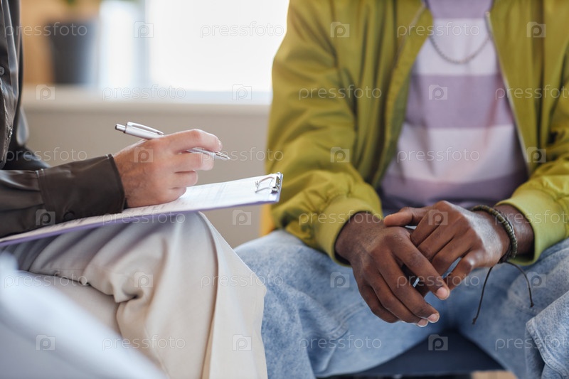 Психолог делает записи и разговаривает с пациентом