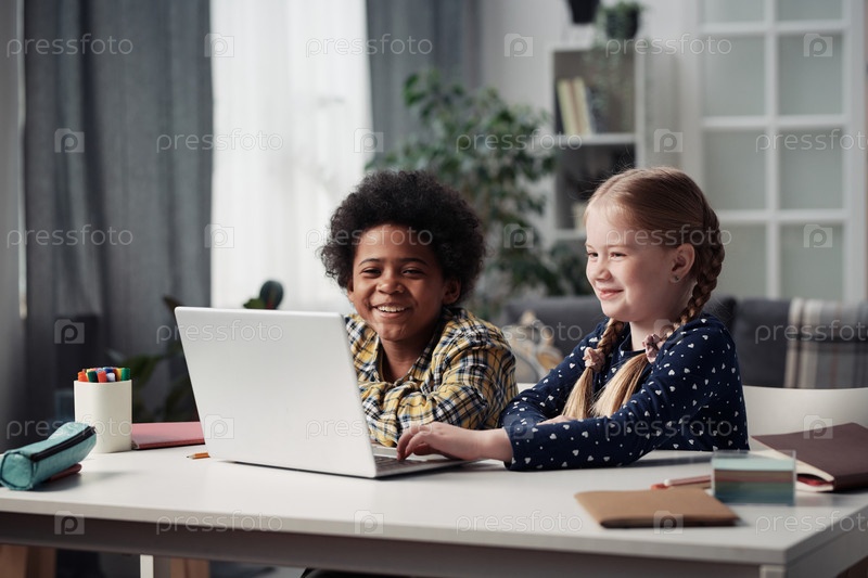 Дети, использующие ноутбук за столом дома