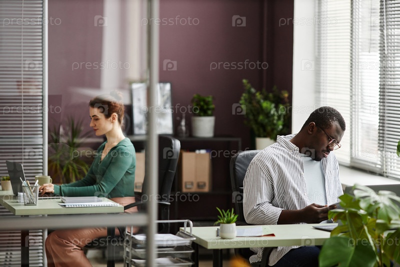 Два человека работают за столами в открытом офисе, украшенном живыми зелеными растениями