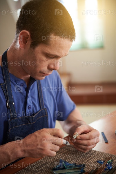 Работник, склеивающий различные кусочки стекла