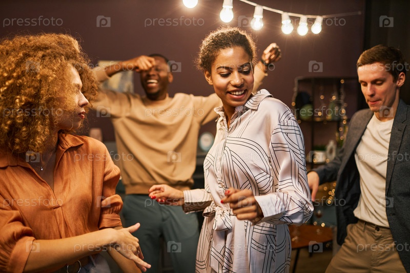 Молодая улыбающаяся афроамериканская женщина танцует среди своих друзей