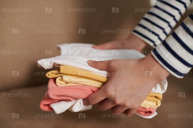 Женщина кладет аккуратные футболки на диван