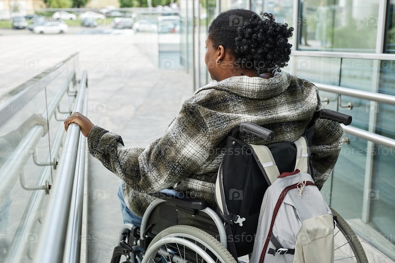 Женщина в инвалидном кресле на доступной пандусе в городе