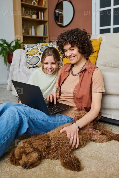 Семья с собакой использует ноутбук
