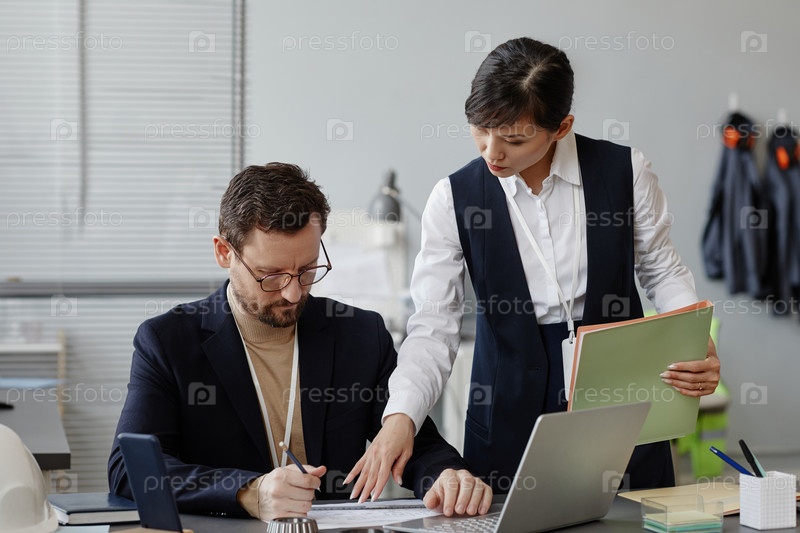 Молодая азиатская бизнесвуменка обучает инженера на рабочем месте в офисе