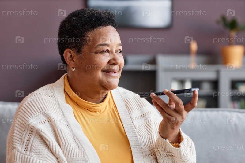 Черная старшая женщина записывает голосовое сообщение
