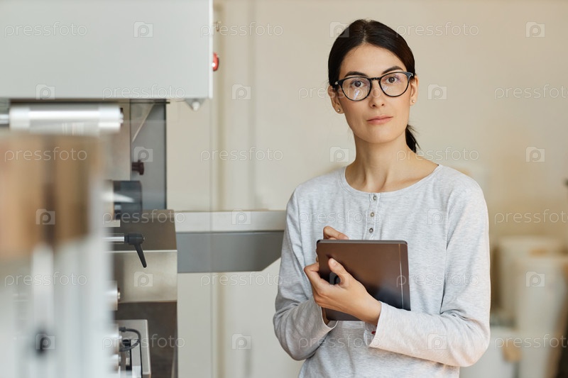Молодая женщина на современной фабрике носит очки и держит планшет