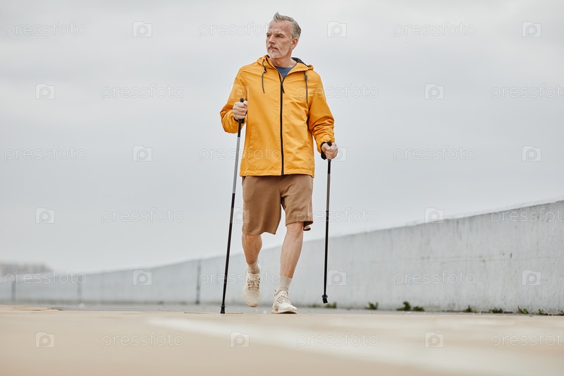 Зрелый мужчина скандинавская ходьба активная