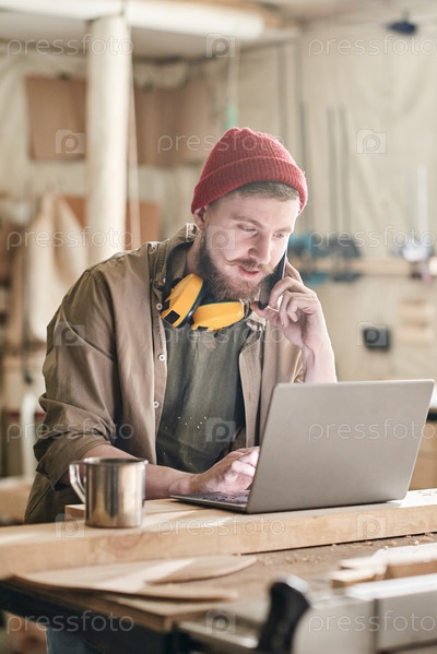 Молодой лесоруб разговаривает по телефону