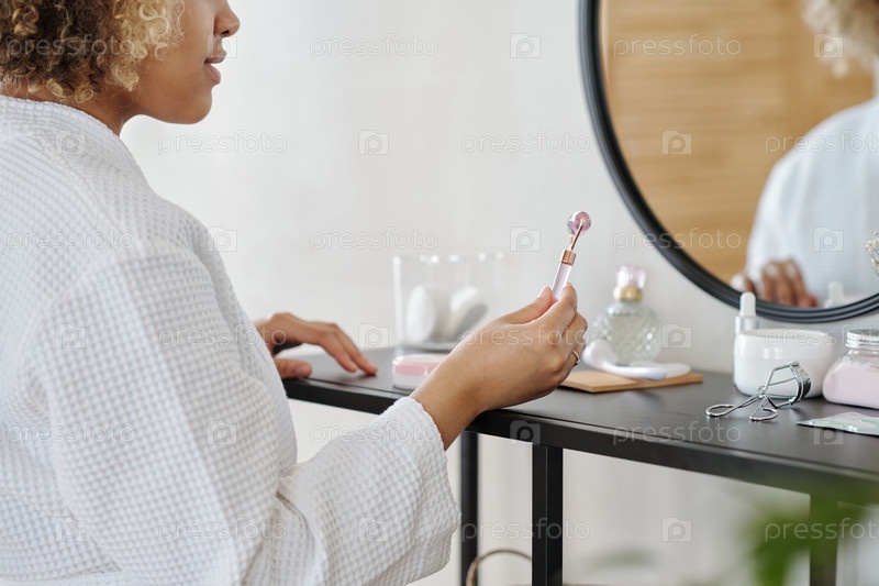 Молодая женщина в белом халате держит массажный ролик перед процедурой красоты