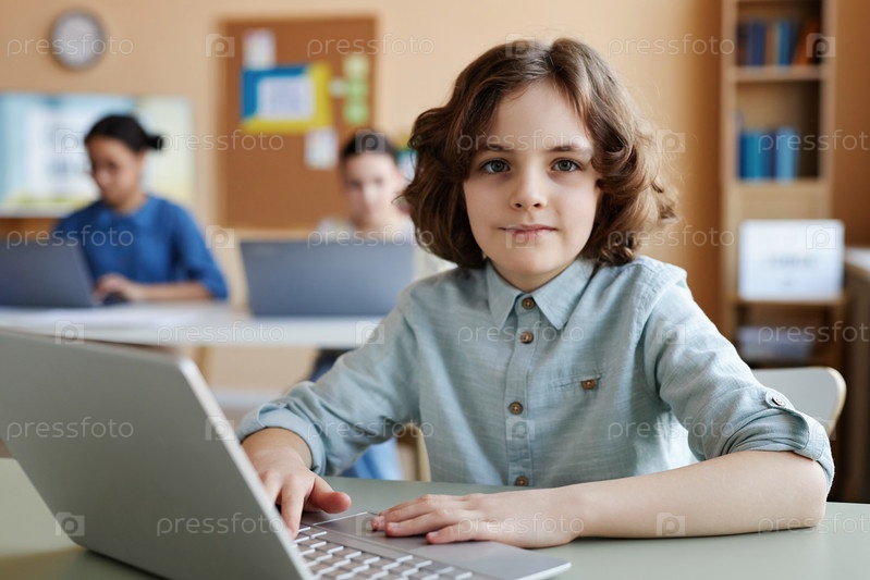 Школьник, использующий ноутбук во время урока в классе