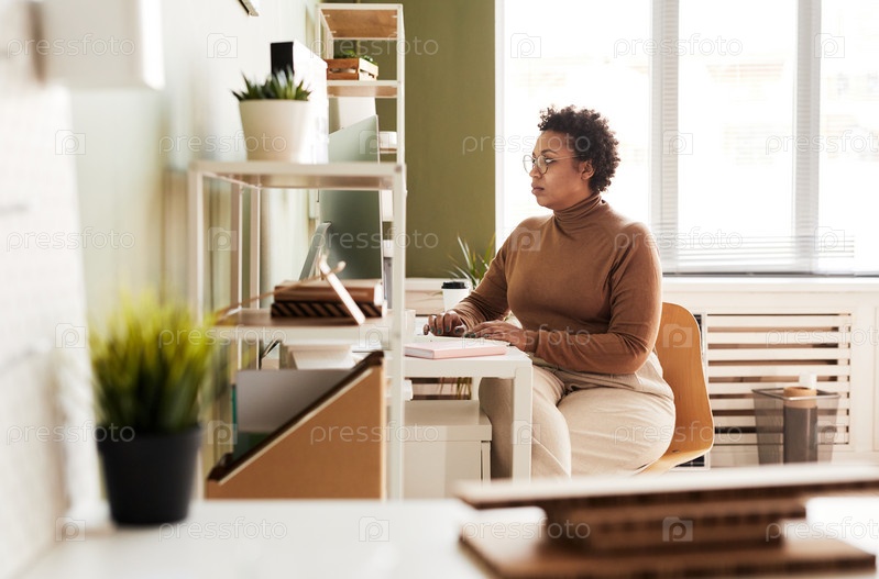 Африканская бизнесвумен, работающая на компьютере в офисе