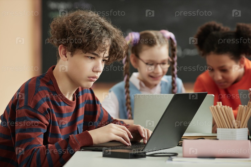 Боковой вид школьник-подросток, использующий ноутбук в классе