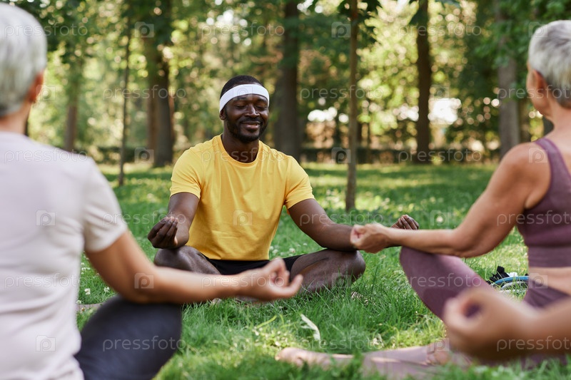 Мужской инструктор по йоге, тренирующий медитацию на открытом воздухе