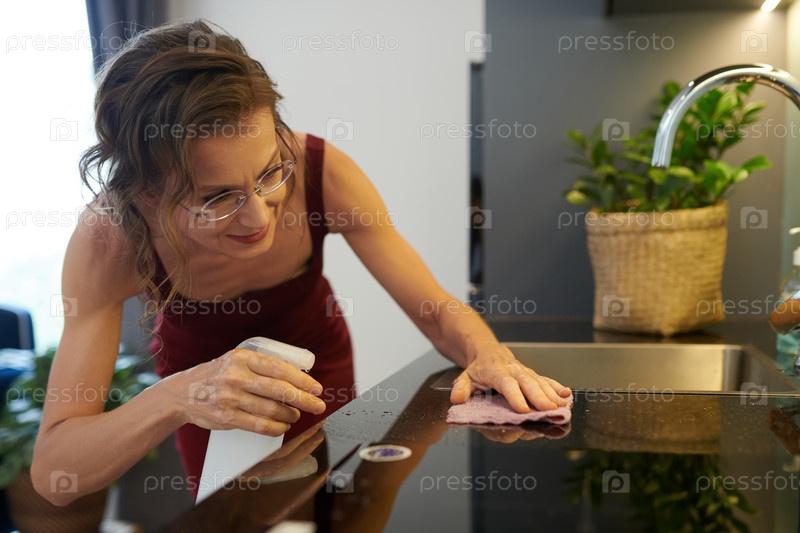 Женщина, убирающая кухонный стол