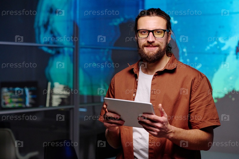 Молодой улыбающийся ИТ-менеджер с планшетом, смотрящий на камеру
