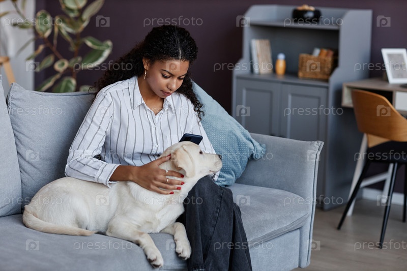 Молодая чернокожая женщина обнимается с милым щенком на диване дома