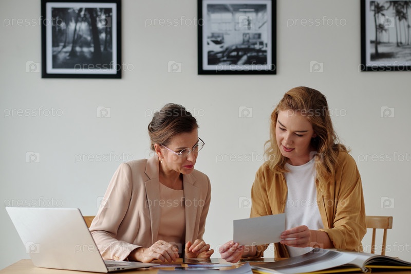 Молодая дизайнерка показывает фото произведений искусства своему менеджеру